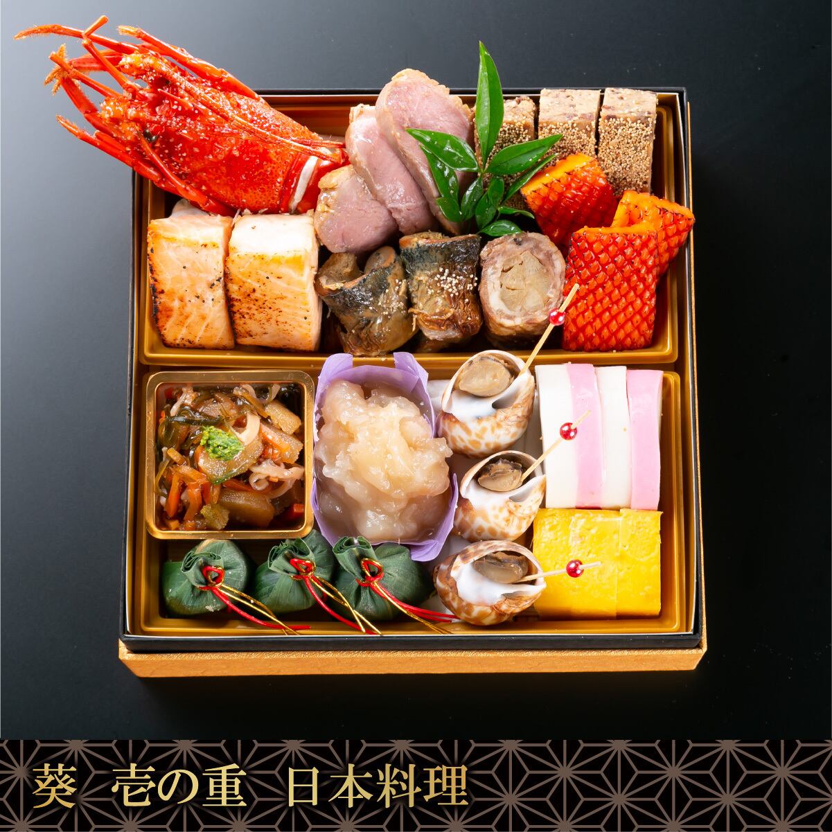 伊勢海老・烏賊短冊ウニ焼・鮭西京焼・秋刀魚肝焼き・鴨オレンジ煮・鶏松風・牛八幡巻・南天・松前漬・紅白かまぼこ・豆金団・ばい貝旨煮・笹よもぎ餅・カステラ焼き・花山椒