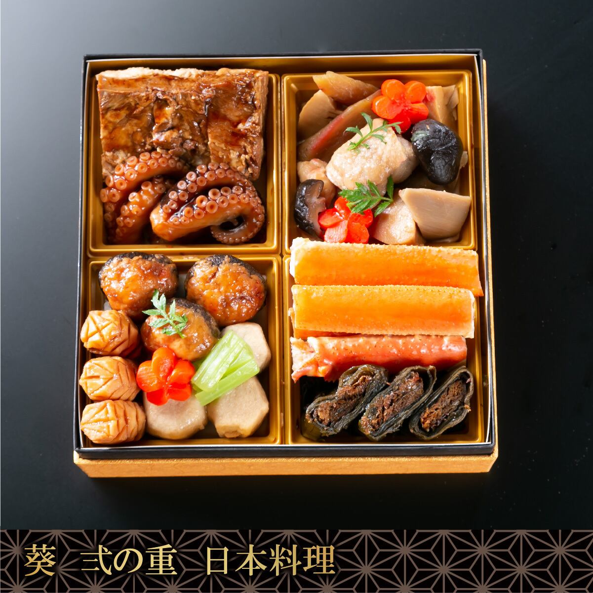 鰊昆布巻き・ずわい蟹柚香煮・筑前煮・鳥・筍・蓮根・牛蒡・煮椎茸・梅人参・裏白椎茸・六方芋・松かさ慈姑・蕗青煮・豚柔らか煮・小蛸照り煮